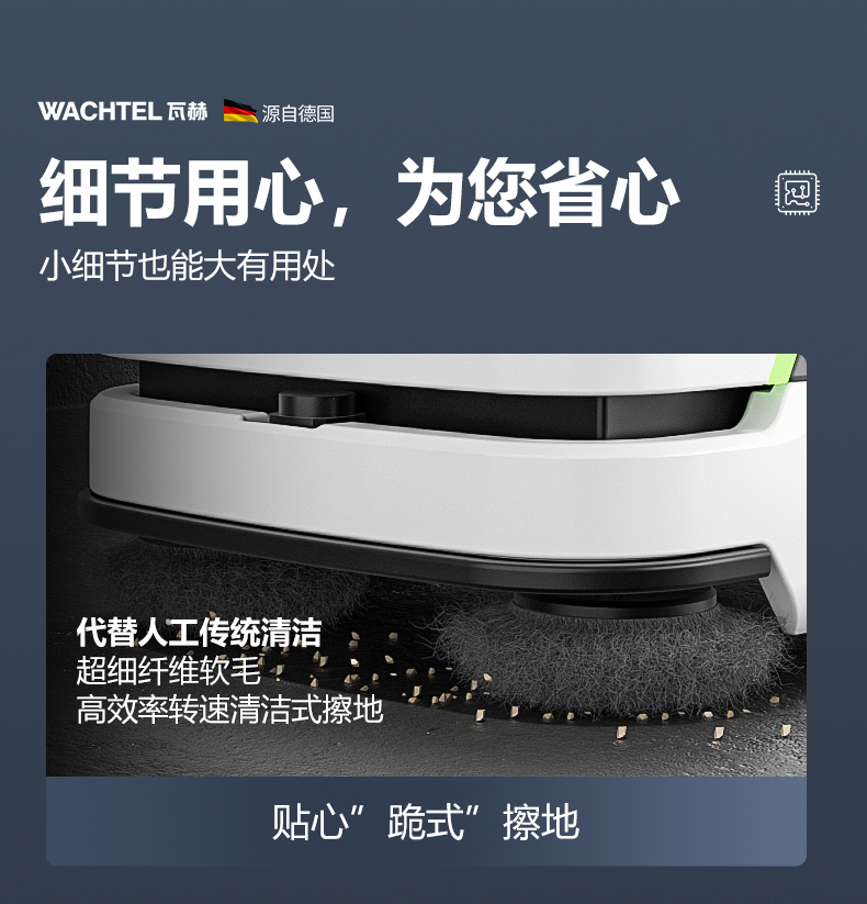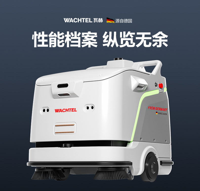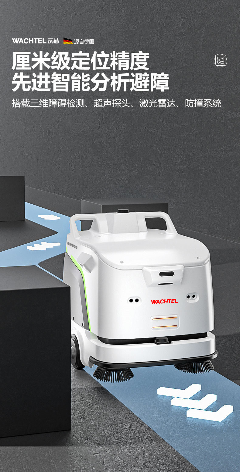品牌:WACHTEL 名稱:掃拖吸一體智能機器人 型號:SW800 功能:掃地+洗地+吸塵+塵推 特點:自動充電+自動避讓+自動乘梯+斷點續掃 控制方式:自動/人工 外觀尺寸: 1020*847*915mm 充電樁尺寸:430*290*440mm 清潔寬度:600 mm 塵推寬度:800 mm 清潔效率:2300m²/h 工作時間:4h 工作噪音:≤63dB 電池:24V/50AH/100AH鋰電池 重量:150kg 防護措施:激光雷達+超聲探頭+深度攝像頭