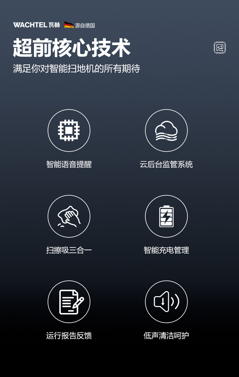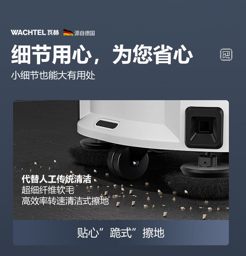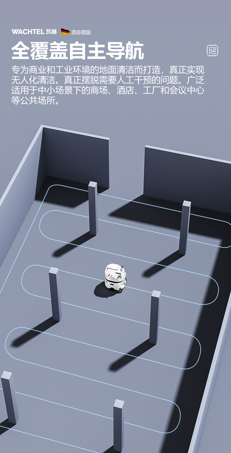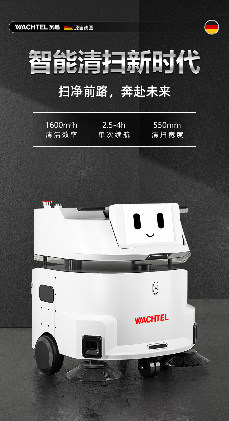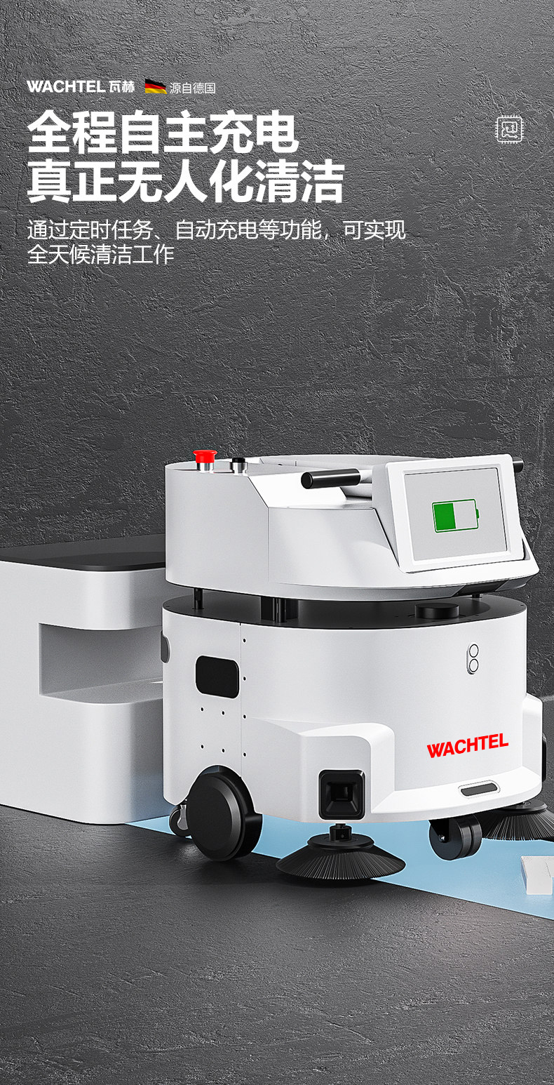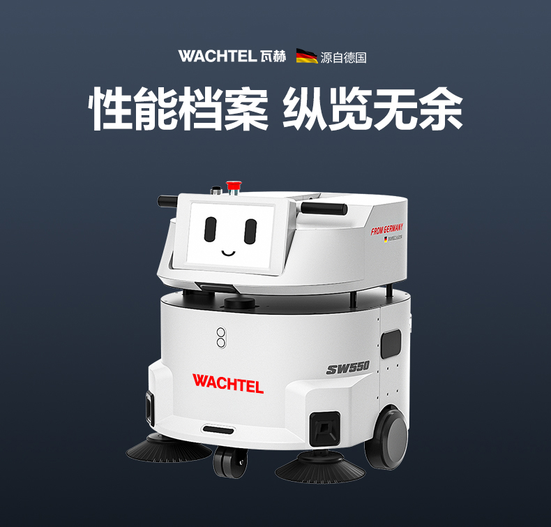 品牌:WACHTEL 名稱:掃拖吸一體智能機器人 型號:SW550 功能:掃地+洗地+吸塵+塵推 特點:自動充電+自動避讓+自動乘梯+斷點續掃 控制方式:自動/人工 外觀尺寸: 615*585*630mm 充電樁尺寸:430*290*440mm 清掃寬度:550 mm 清潔效率:1600m²/h 工作噪音:≤62dB 工作時間:5~8h 電池:24V/50AH鋰電池 重量:85kg 防護措施:激光雷達+超聲探頭+深度攝像頭